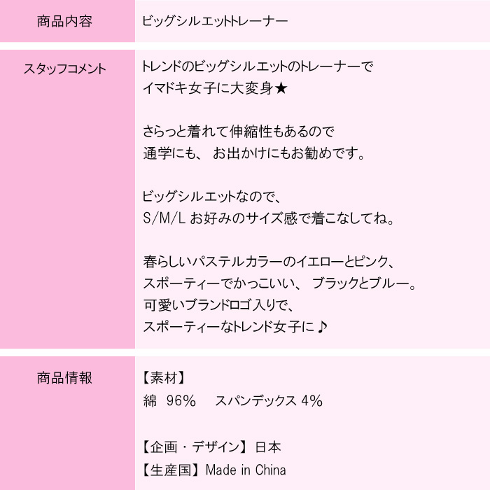 TOP ブランドangel'srobe ~エンジェルローブ 子供服トップス 子供服 トレーナー 黒 ブラック ピンク イエロー ブルー S M L 110cm 130cm 150cm 秋 冬 かわいい 子供 子ども 服 キッズ ビッグシルエットトレーナー 女の子 ネコポス不可商品 価格: ¥3,850 (税込) 販売期間: 数量: 着 カラーサイズ在庫購入イエロー[code:__SYE__]S [code:__S110__]○ M [code:__S130__]○ L [code:__S150__]○ ピンク[code:__SPK__]S [code:__S110__]○ M [code:__S130__]○ L [code:__S150__]○ ブルー[code:__SBU__]S [code:__S110__]○ M [code:__S130__]○ L [code:__S150__]○ ブラック[code:__SBK__]S [code:__S110__]× M [code:__S130__]× L [code:__S150__]× カラーサイズ在庫購入イエロー[code:__SYE__]S [code:__S110__]○ M [code:__S130__]○ L [code:__S150__]○ ピンク[code:__SPK__]S [code:__S110__]○ M [code:__S130__]○ L [code:__S150__]○ ブルー[code:__SBU__]S [code:__S110__]○ M [code:__S130__]○ L [code:__S150__]○ ブラック[code:__SBK__]S [code:__S110__]× M [code:__S130__]× L [code:__S150__]× 返品についての詳細はこちら -------------------- ※お色味に関しまして、撮影時のライトの関係上 実物よりも若干お色味が薄く見える場合がございます。 予めご了承くださいませ。 --------------------
